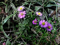 球状にしつらえられた菊は狭い庭に置くと存在感がある。庭は、手入れもしないので、雑草なんかも伸び放題。その雑草の中に、紫の小さな菊も花を付けた。部屋の中からは目に付かないが、ガラス戸を開けると、足元で僅かの風に揺れている。作られた球状に群れて咲いている花には存在感があるが、小さく咲いている花には、また別の風情があって、わたしは心が惹かれる。